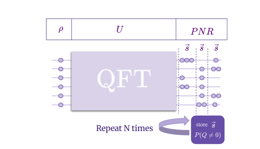 Protocol overview. An n-photon state is sent through an n-mode QFT interferometer and specific output configurations are used to estimate GI.