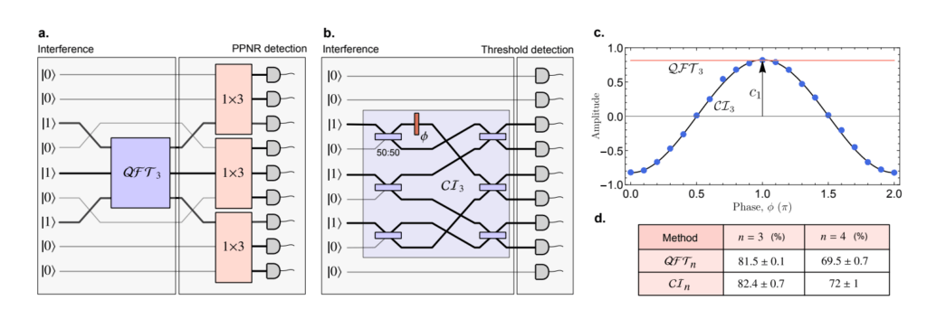 The protocol was implemented experimentally on Quandela’s reconfigurable photonic quantum processor, and benchmarked against the cyclic interferometer approach. Experiments were performed for n = 3 and n = 4 photons. The QFT protocol requires photon number resolving detectors, i.e. detectors that count how many photons are in each mode. At Quandela, the threshold detectors tell us if a photon is present or not, but not how many. Therefore, for the experiment the circuit was manipulated to implement pseudo photon-number resolving detection (PPNR).